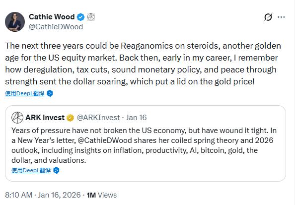 ARK Invest创始人Cathie Wood(“木头姐”)在最新的2026年新年致投资者信中发布宏观展望,将未来三年比作“加强版里根经济学”(Reaganomics on steroids)。