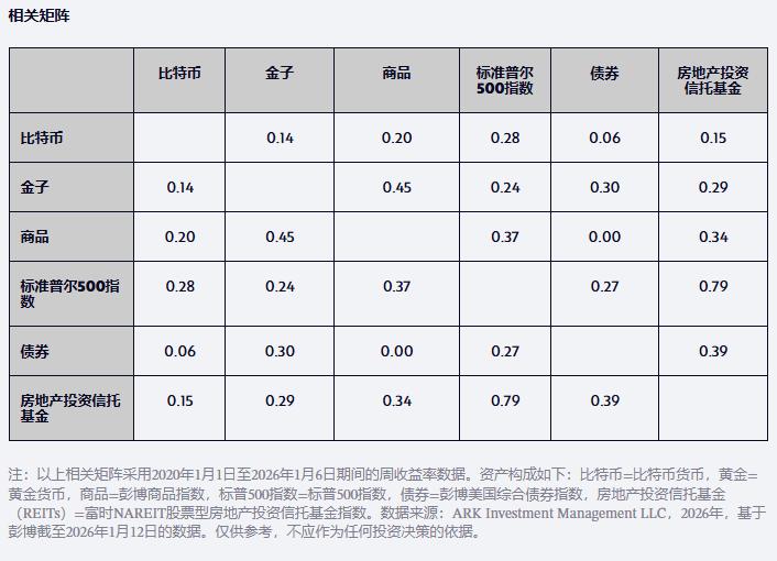 对于资产配置者而言,另一个重要的考量因素是比特币收益相对于黄金收益以及自2020年以来与其他主要资产类别收益的相关性较低,如下表所示。