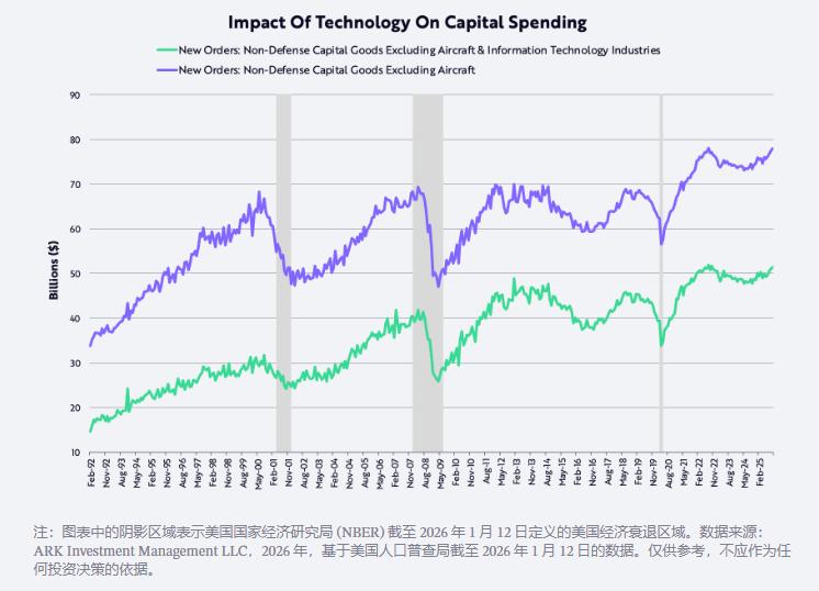 与此同时,以非国防资本品(不包括飞机)衡量的资本支出在2022年中期达到峰值,此后无论是否受到技术影响,该支出水平都已回升至该水平。