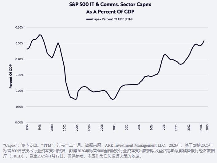 如下所示,人工智能的蓬勃发展正推动资本支出达到自上世纪九十年代末以来的最高水平。