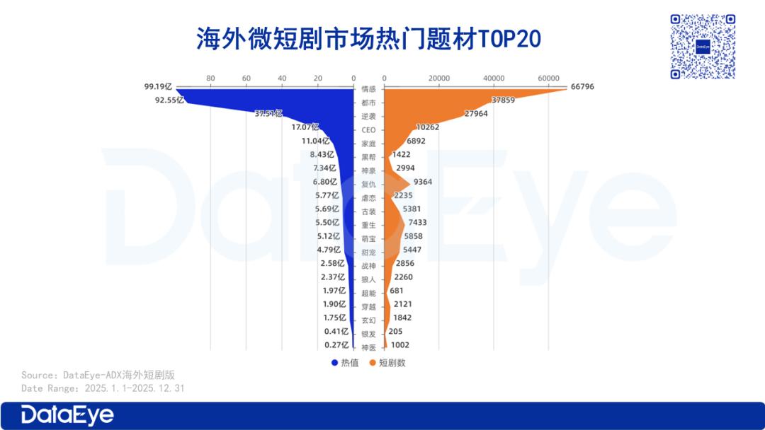 “情感”与“都市”两大题材表现亮眼,二者热值均突破90亿,短剧数量也超3万部,共同跻身第一梯队。