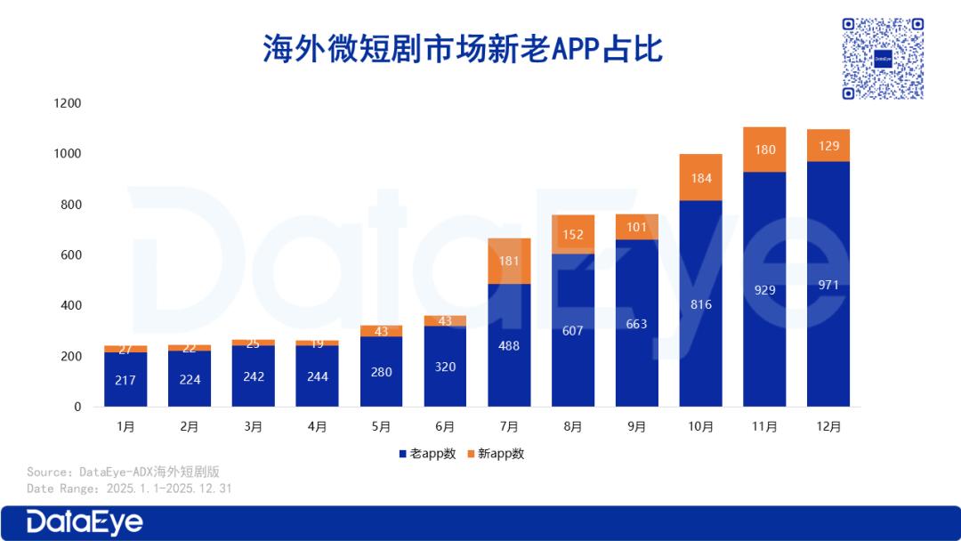 从新增的海外微短剧APP来看,2025年下半年以来,海外微短剧APP的上线数量以每月超100款的数量在增长,且新增数不断增加。