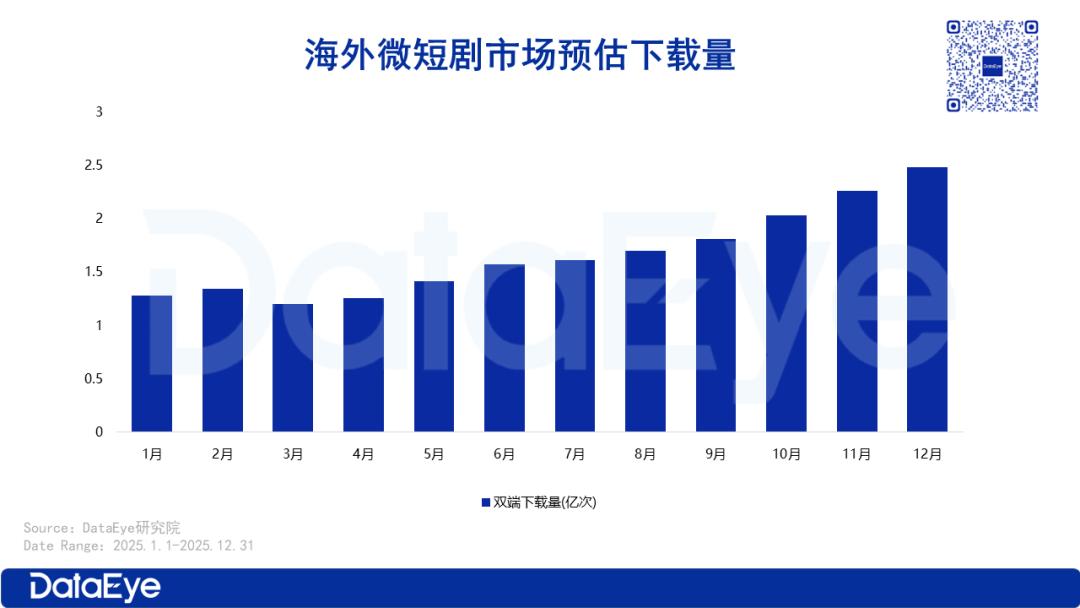据DataEye研究院预估,2025年海外微短剧市场预估双端下载量高达18.55亿次,同比激增超300%,增长势头极为迅猛。