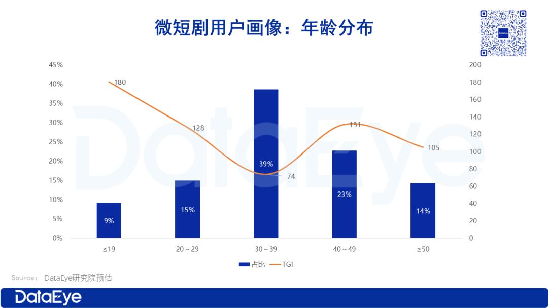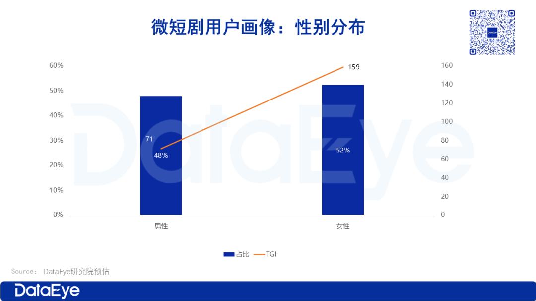值得关注的是,女性用户的偏好度(TGI)高达159,而男性用户仅为71。这意味着女性用户对微短剧的偏好程度与使用粘性均远高于男性群体。