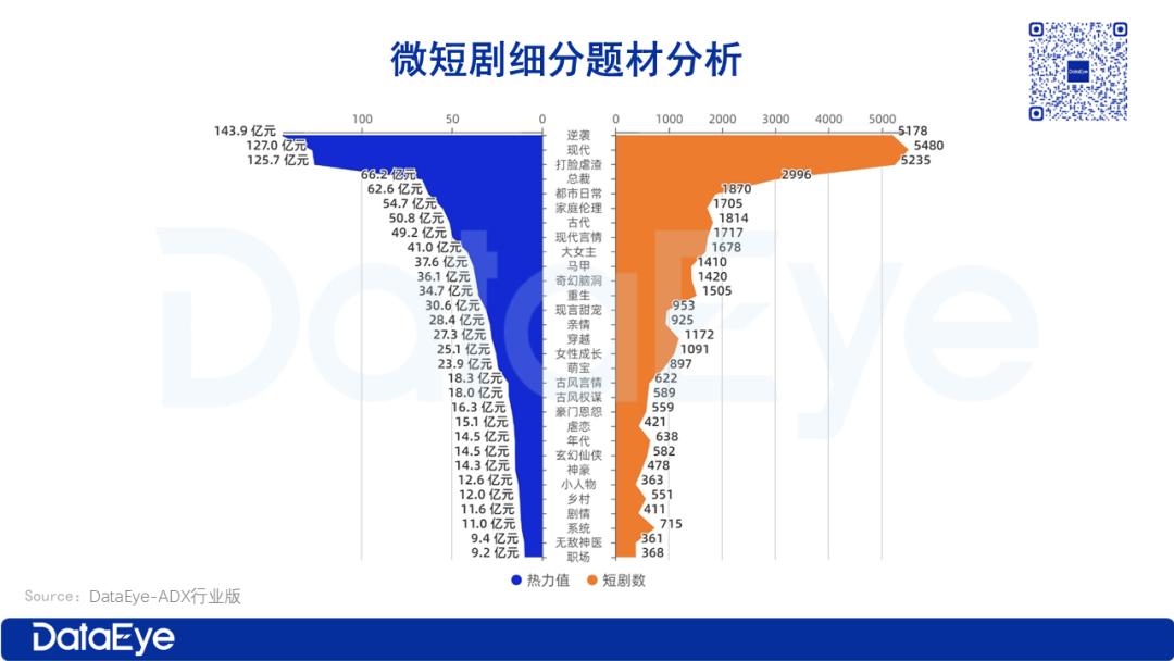 “逆袭”题材热力值达143.9亿,短剧数达5178部,在“热度规模”和“作品数量” 上均为绝对第一,是微短剧最核心的赛道。