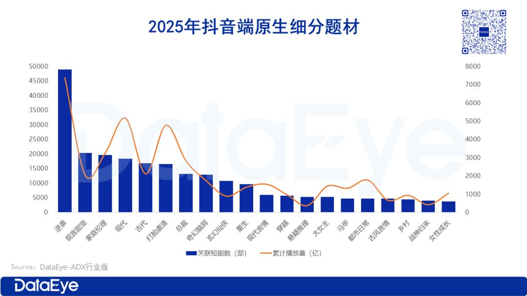 抖音端原生微短剧题材共68种,其中,逆袭、现言甜宠、家庭伦理关联短剧数为TOP3;逆袭、现代和打脸虐渣累计播放量位居TOP3。