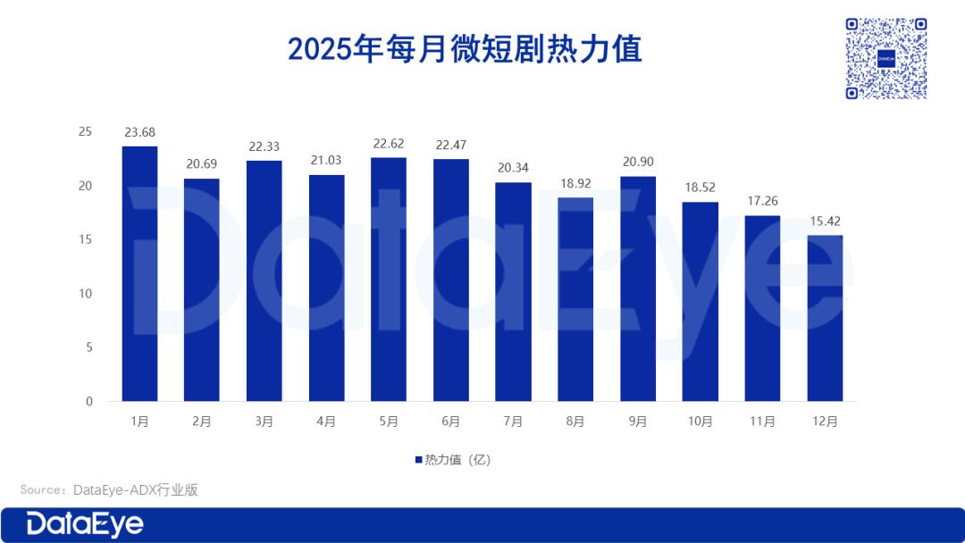 ADX行业版数据显示:2025年国内微短剧市场热力值总额约244亿,每月平均热力值24.42亿,与2024年基本持平。