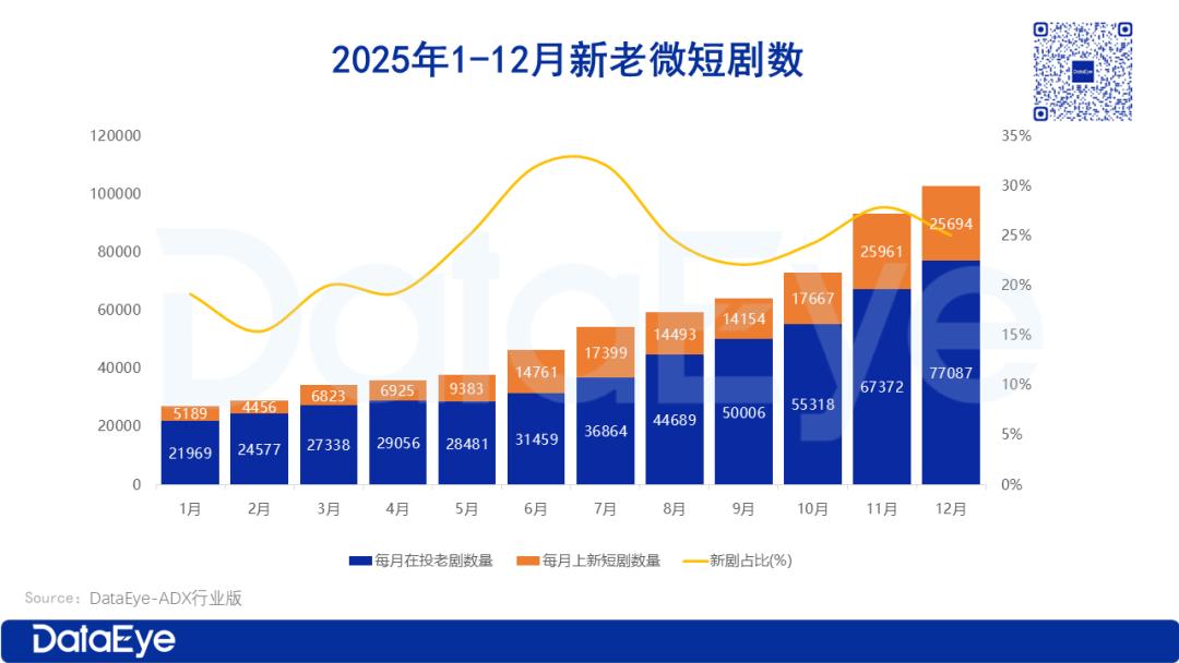 ADX行业版数据显示:2025年,参与投流的微短剧总数超19.2万部,其中新剧总数超16.2万部,占比约84%。