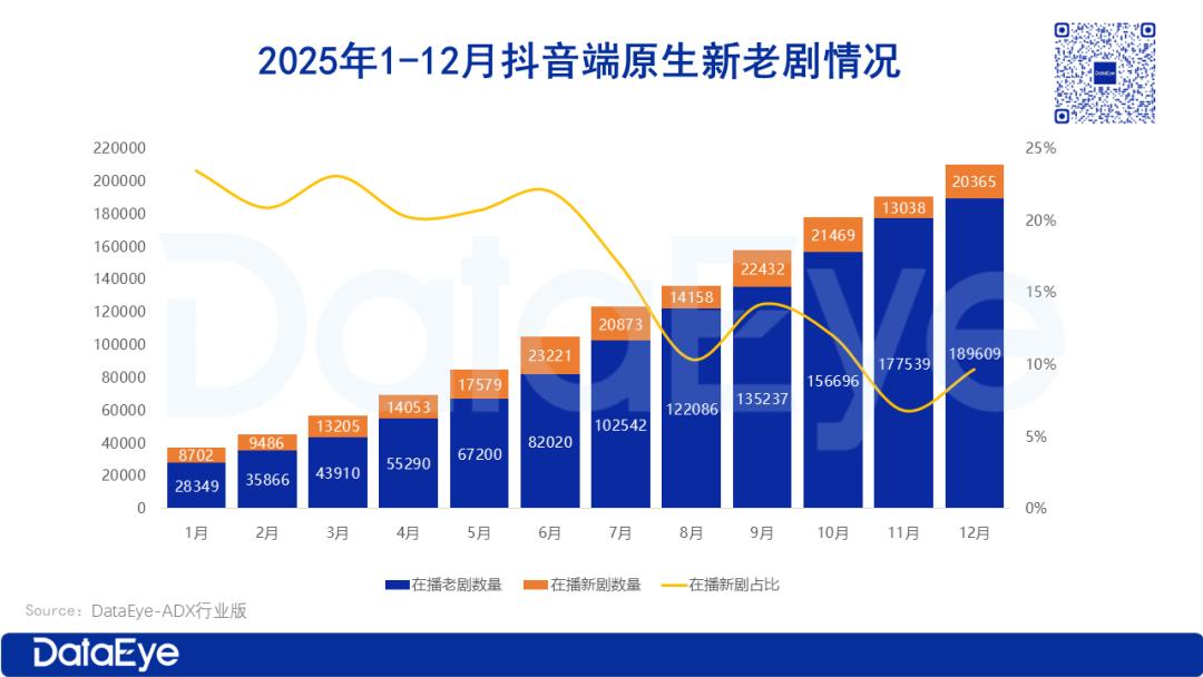 从整体趋势来看,抖音端原生微短剧市场极速飙升。2025年全年,在播微短剧数量突破20.48万,创历史新高;在播新剧数超18.5万部,占比约90%。