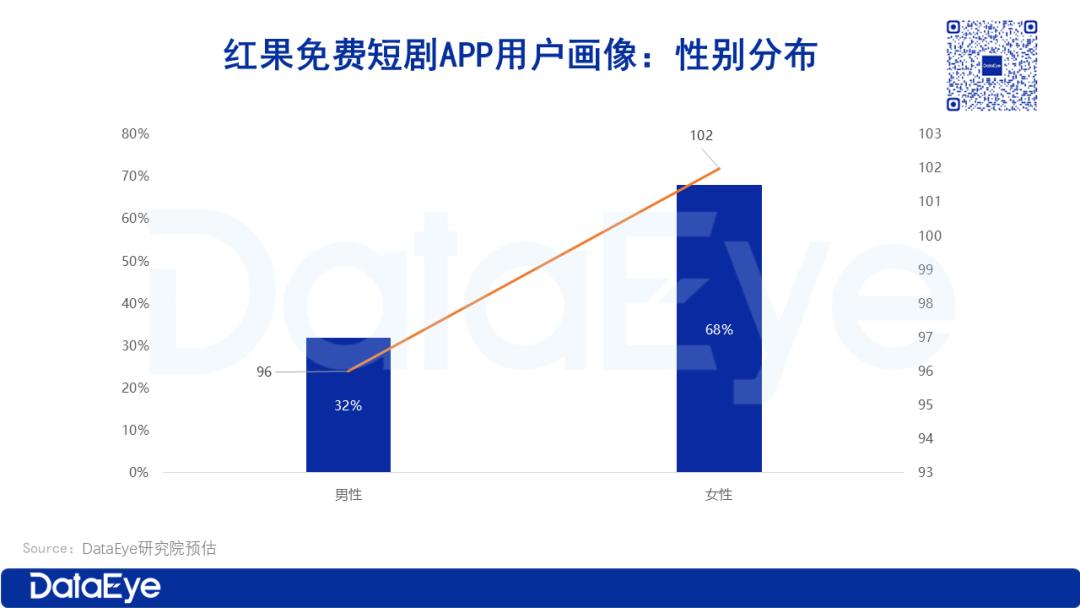从性别分布来看,红果短剧的女性用户占比高达68%,男性用户占比为32%。和市场大盘相比,红果短剧女性用户占比大幅领先。
