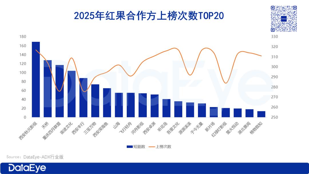 DataEye-ADX数据显示,从上榜短剧数来看,西安秋元(169部)、天桥(128部)和重庆四月联盟(117部)包揽TOP3,均是年度“高产王”。