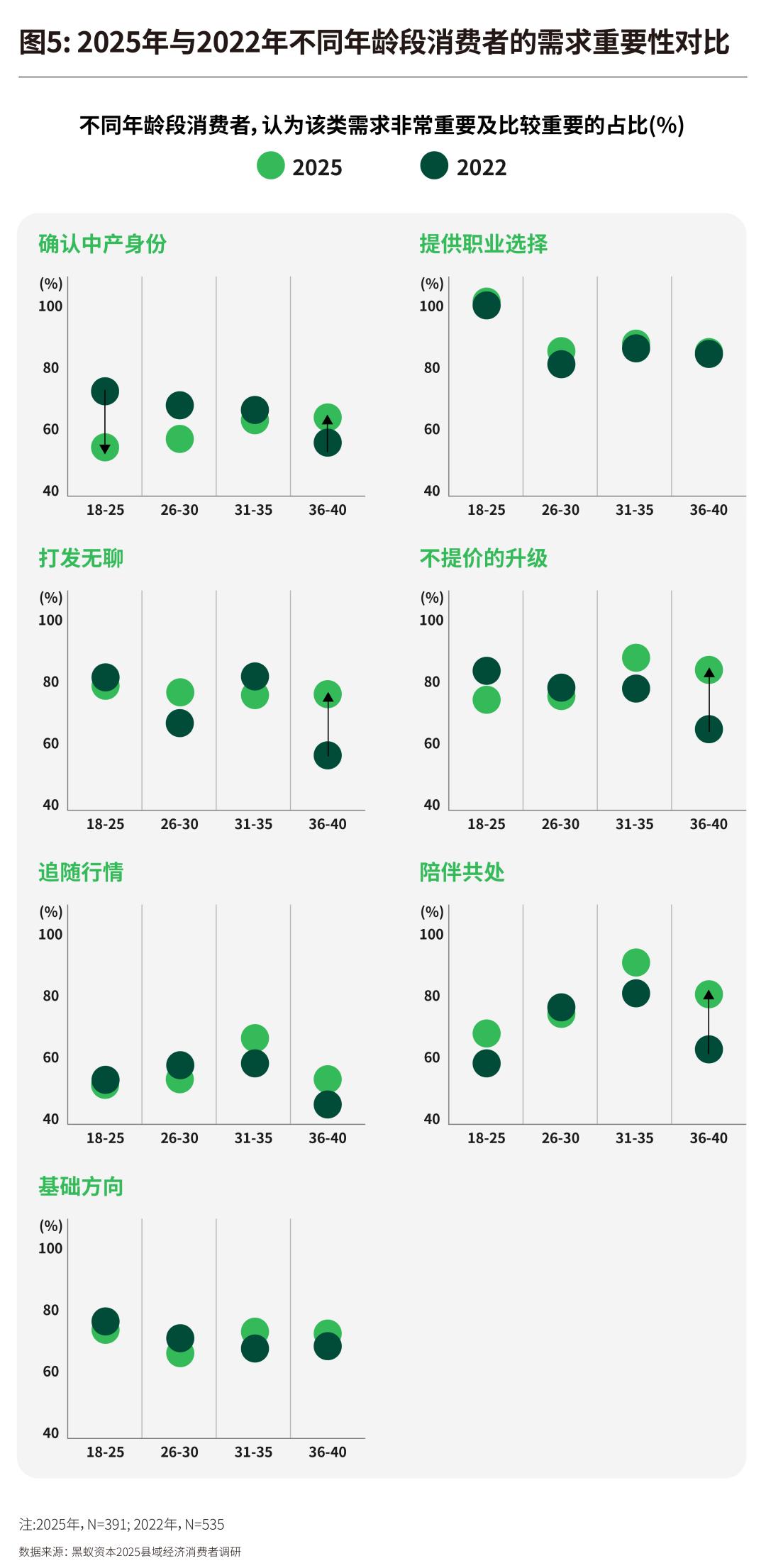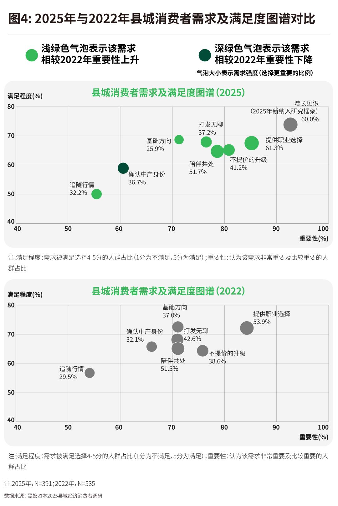 通过三年间两轮田野访谈,我们将“增长见识”这一长期存在的需求纳入2025年的研究分析框架。本次调研发现:一方面,打发无聊、不提价的升级及陪伴共处的需求重要性有所上升,而确认中产身份的重要性下降了;另一方面,所有需求的满足度持平或有所下降。
