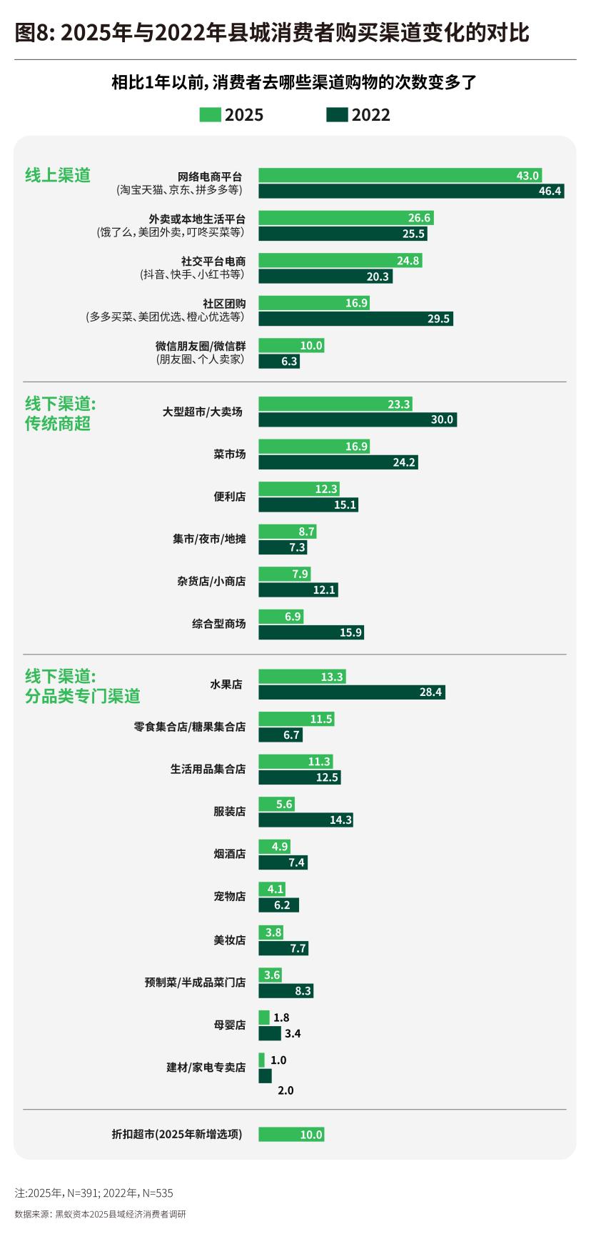 2025年与2022年相比,县城消费者的购物渠道选择呈现出分层化的特点,其演变路径与高线城市的消费习惯同步性进一步增强。