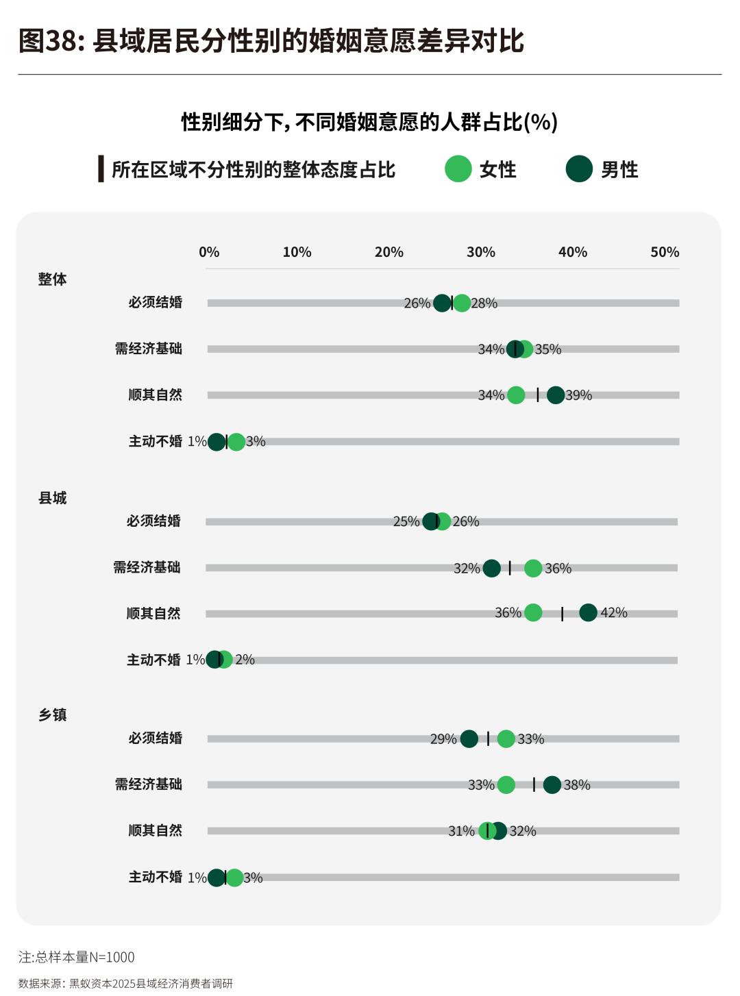 乡镇的环境中,认为“必须结婚”的传统压力(男29.2%,女32.9%)都高于县城水平,乡镇男性展现出更深的经济焦虑,对“需要经济基础”的诉求(37.7%)最为强烈,高于女性。但乡镇女性“主动选择不结婚”的比例(2.9%)是男性(0.8%)的三倍有余。
