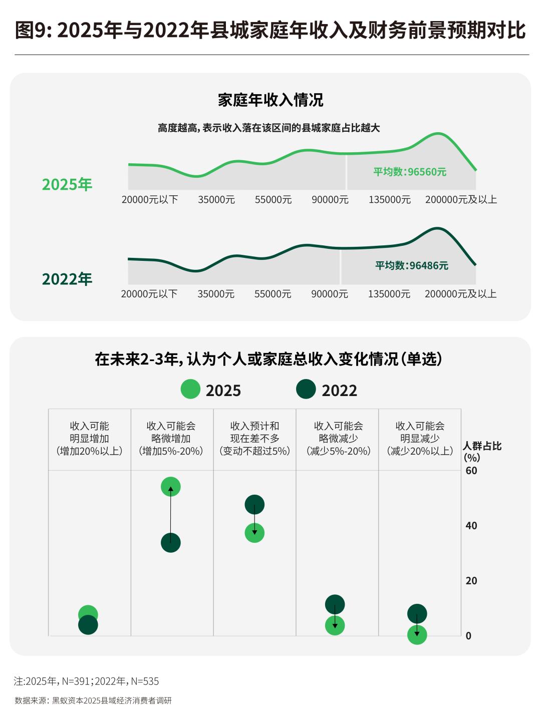 2025年,县城居民预期未来2-3年收入会增长的比例较2022年有较大提升,但对于增长幅度的预期相对保守。与收入改善同步的是,他们对于未来支出的预期也有提升,超过半数的县城居民(51.4%)在2025年预计未来会增加支出,2022年这一比例则为36.3%。