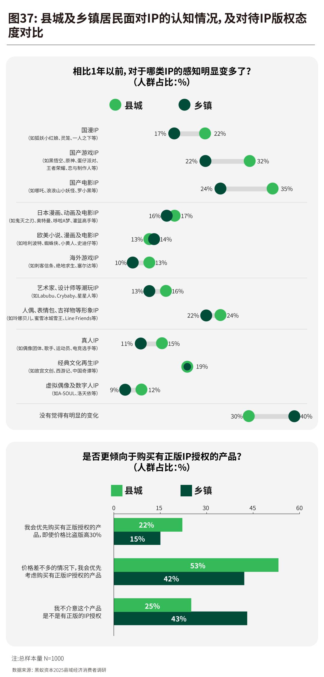 在2025年的定量调研中,我们看到县域消费者对于“为正版IP付费”的态度呈现出鲜明的务实态度和清晰的梯度。首先他们高度价格敏感,付费意愿存在明确前提,即“支持正版”并非一种不计成本的信念,更多是一种在价格合理时的优先选择。同时,乡镇居民表现出更强的价格导向和“无感”心态——高达43%的人表示“不介意是否为正版”,远超县城居民的25%。
