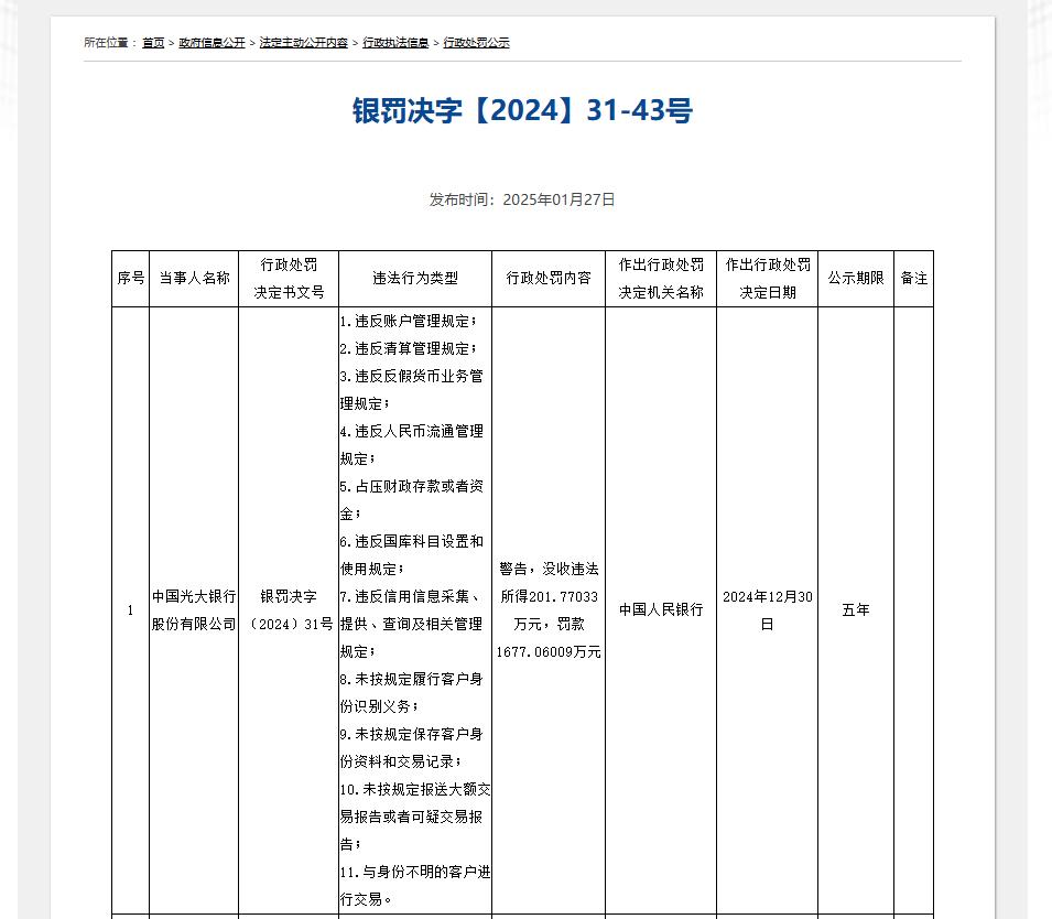 而中国人民银行官网在2025年1月27日公布的(银罚决字〔2024〕31号)显示,中国光大银行股份有限公司,因“1.违反账户管理规定;2.违反清算管理规定;3.违反反假货币业务管理规定;4.违反人民币流通管理规定;5.占压财政存款或者资金;6.违反国库科目设置和使用规定;7.违反信用信息采集、提供、查询及相关管理规定;8.未按规定履行客户身份识别义务;9.未按规定保存客户身份资料和交易记录;10.未按规定报送大额交易报告或者可疑交易报告;11.与身份不明的客户进行交易”,中国人民银行于2024年12月30日对其作出“警告,没收违法所得201.77033万元,罚款1677.06009万元”的行政处罚决定。