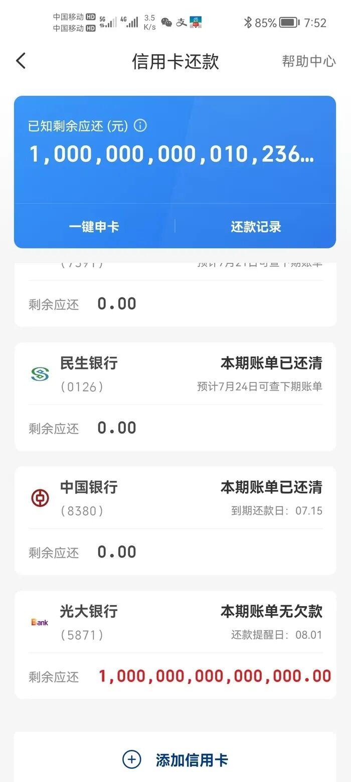 一张突然出现的1000万亿元欠款账单,更让覃先生陷入被动。据新黄河客户端报道,2022年11月,覃先生在云闪付信用卡还款一栏中查询账单发现,竟然有1000万亿元欠款。“覃先生说,这张卡的1000万亿元欠款仅在云闪付平台显示,光大银行的App及其他流水记录中并没有,在此期间,他向其他银行申请贷款时再遭拒绝,不知道是否受此影响。而这项异常记录显示,却一直持续到2023年12月才被取消。”