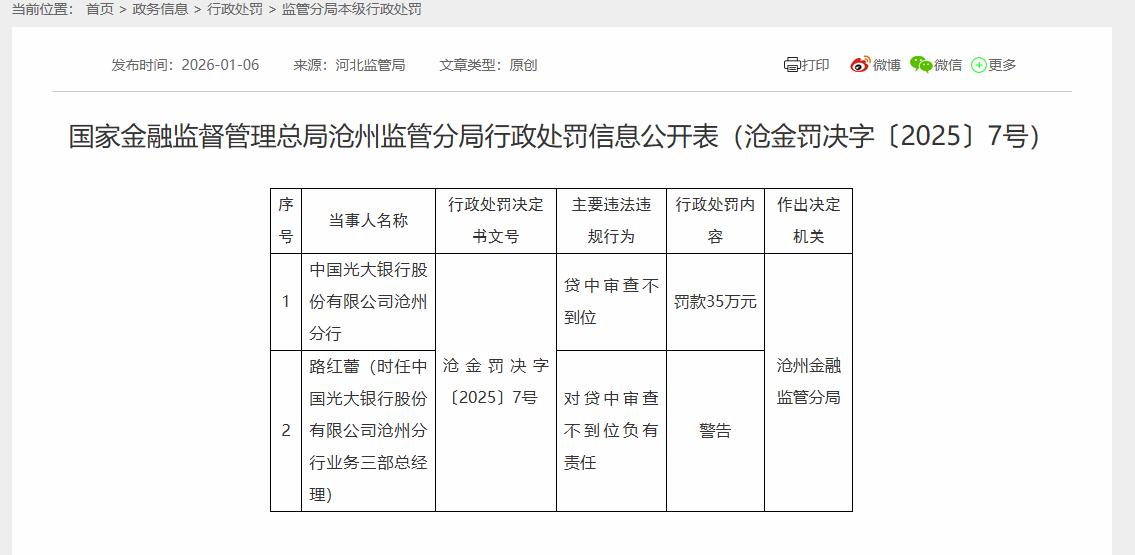 同日,国家金融监督管理总局沧州监管分局行政处罚信息公开表(沧金罚决字〔2025〕7号)显示,中国光大银行股份有限公司沧州分行,因“贷中审查不到位”,沧州金融监管分局对其罚款35万元。