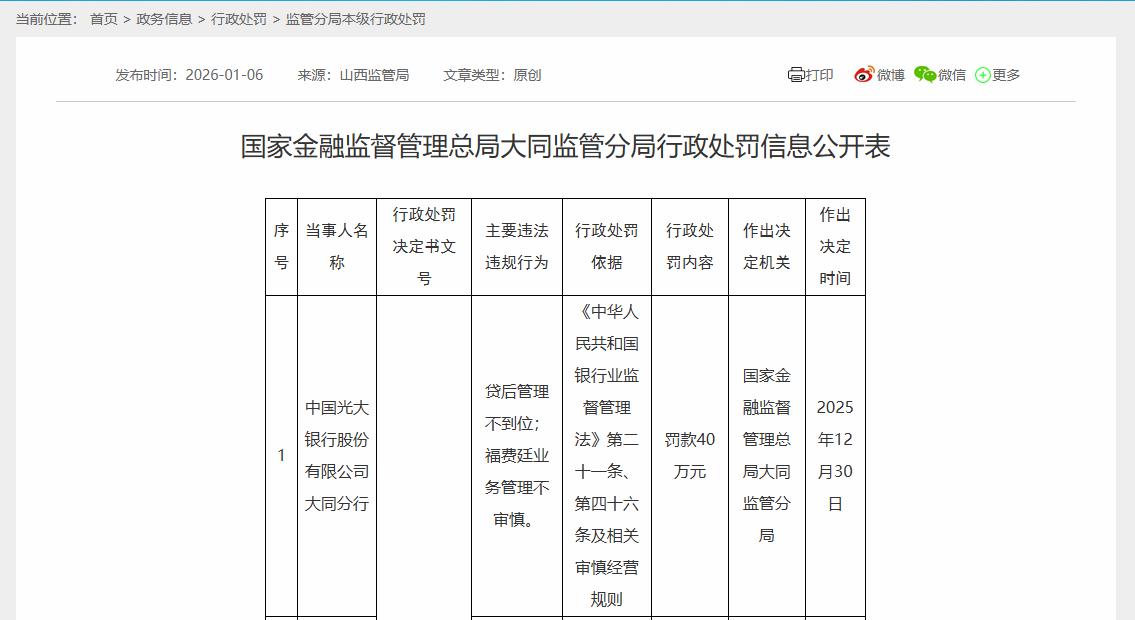 2026年1月6日,国家金融监督管理总局大同监管分局行政处罚信息公开表(同金管罚决字〔2025〕45号)显示,中国光大银行股份有限公司大同分行,因“贷后管理不到位;福费廷业务管理不审慎”,国家金融监督管理总局大同监管分局于2025年12月30日对其作出罚款40万元的行政处罚。