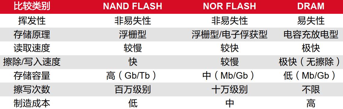 NOR由于支持随机访问,读取速度比NAND 快;而NAND 以块为单位进行擦除和写入操作,其擦除和写入速度比NOR快很多。NAND内部电路更简单,因此数据密度大、体积小,成本也低,市场上一些大容量的FLASH都采用NAND型,像大家常用的 SSD、U盘、SD卡等。小容量的2M - 12M的FLASH多是NOR型,NOR比较适合频繁随机读写的场合,通常用于存储程序代码并直接在闪存内运行。相比于Flash,DRAM具有较高读写速度、存储时间短等优势,但单位成本更高,主要用于PC内存(如DDR)、手机内存(如LPDDR)和服务器等设备。