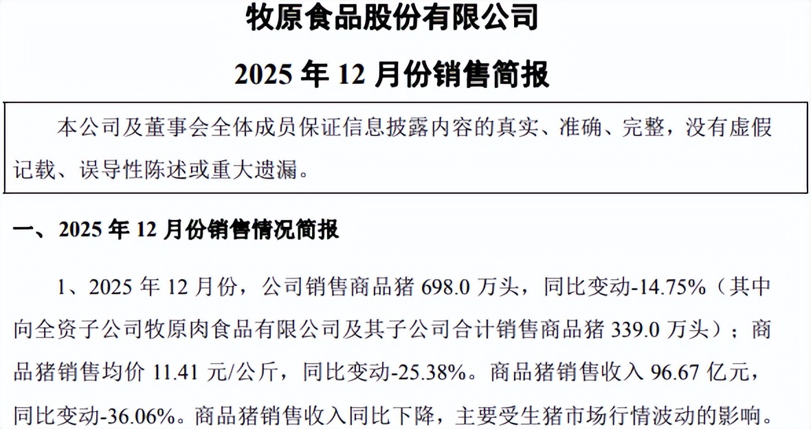 更值得警惕的是商品猪销售数据:2025年12月,牧原股份销售商品猪698万头,同比减少15%;销售均价11.41元/公斤,同比下降25%;销售收入96.67亿元,同比下降36%。量价齐跌的态势清晰地勾勒出行业寒冬的轮廓。