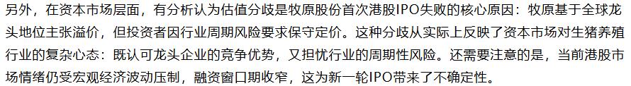 估值分歧映射出资本市场的谨慎态度。有分析认为,牧原首次港股IPO失效的核心原因可能是估值分歧。牧原基于全球龙头地位主张估值溢价,但国际投资者对强周期行业普遍持谨慎态度,特别是当行业处于下行阶段时。