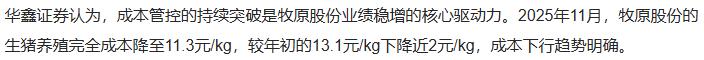 负债结构暗藏风险。尽管牧原2025年成功将负债降低近百亿元,但千亿级别的负债规模依然令人担忧。在生猪价格持续下行的市场环境中,高负债意味着高财务成本和高风险暴露。2025年11月,牧原生猪养殖完全成本已降至11.3元/公斤,较年初下降近2元/公斤,这一成本控制能力在业内确实出色。然而,当商品猪销售均价仅略高于完全成本时,牧原的盈利空间已被极度压缩,抗风险能力面临严峻考验。