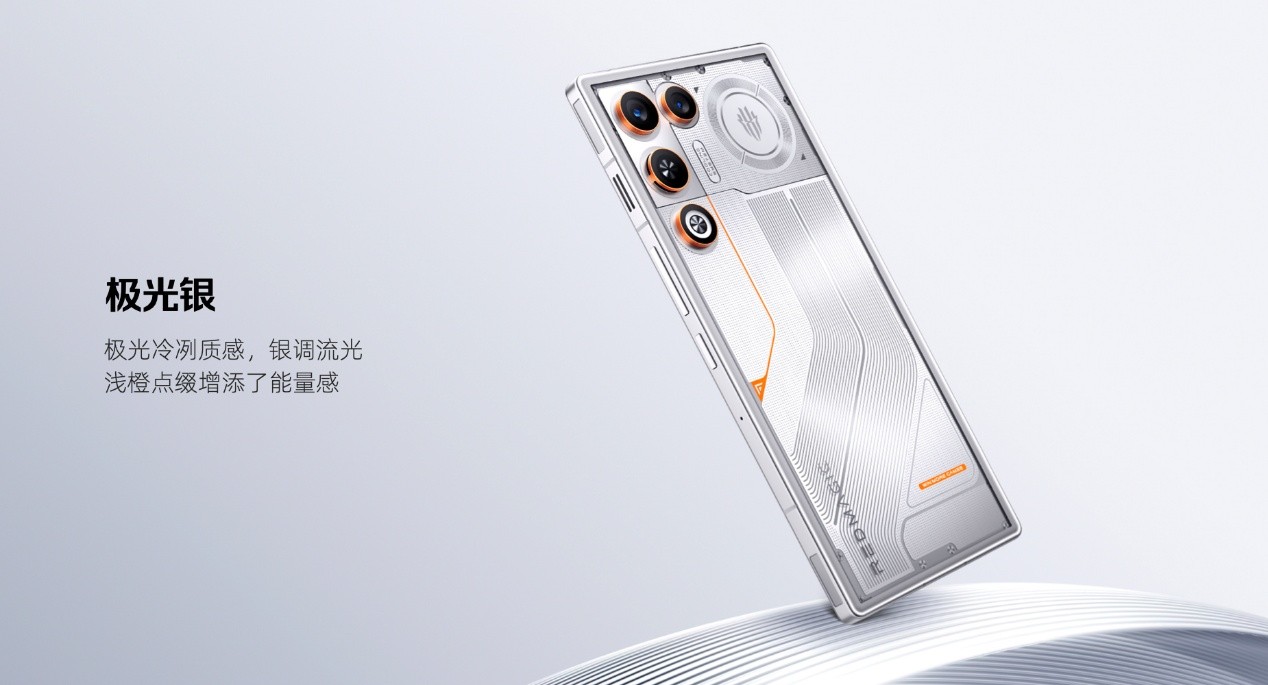 外观设计上,红魔11 Air带来星尘白、量子黑、极光银三款潮流配色,在延续红魔独有的透明美学的基础上,首次采用全系透明机身设计,并将黑胶唱片的复古质感、赛车跑道的速度激情与几何图形元素融入其中,搭配3D弧形玻璃后盖,既彰显极致科技感,又保证了舒适的握持手感。同时标志性的背部RGB灯得到保留,进一步提升电竞氛围。