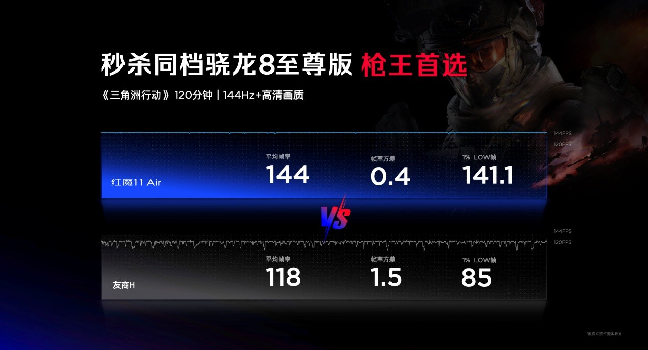 在发布会上,红魔官方也展示了红魔11 Air的游戏实测水平。在144Hz高清画质下运行120分钟《三角洲行动》,红魔11 Air平均帧率为144帧,1%LOW帧为141.1帧,对比机型平均帧率为118帧,1%LOW帧为85帧。
