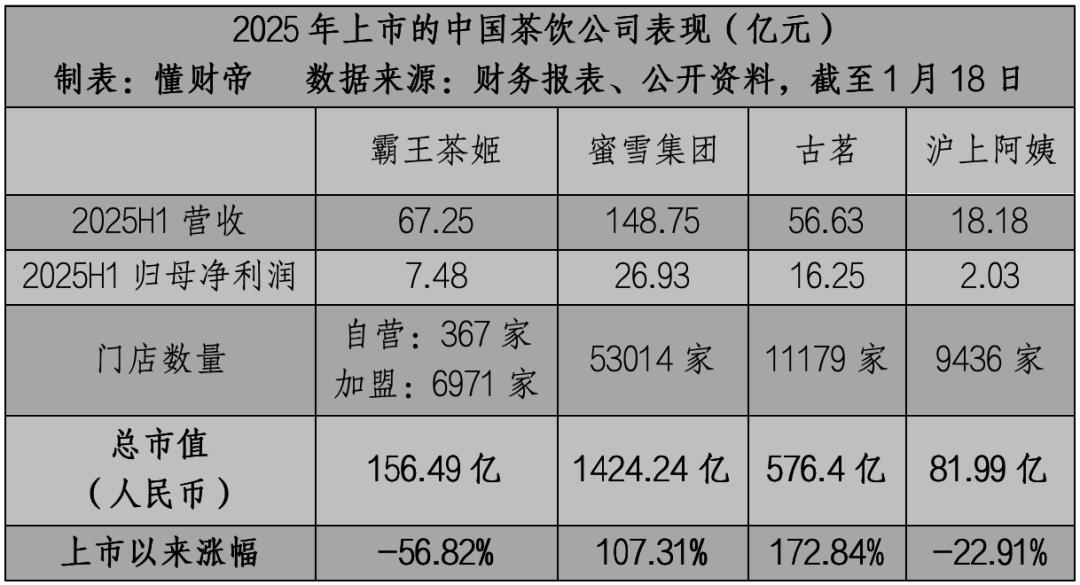 资本市场的定价也体现了这一点,截至1月18日,蜜雪集团总市值1424.24亿元人民币,古茗总市值576.4亿元人民币,分别是霸王茶姬(156.49亿)的9.1倍、3.68倍。