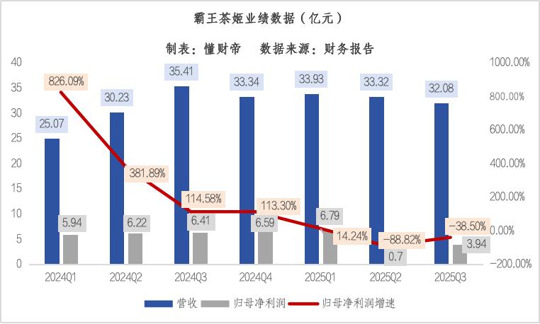 由于霸王茶姬不参加“外卖大战”,产品更新缓慢,业绩已明显降速。2025Q3营收32.08亿元,同比下滑9.4%,归母净利润3.94亿元,大幅下滑38.5%。