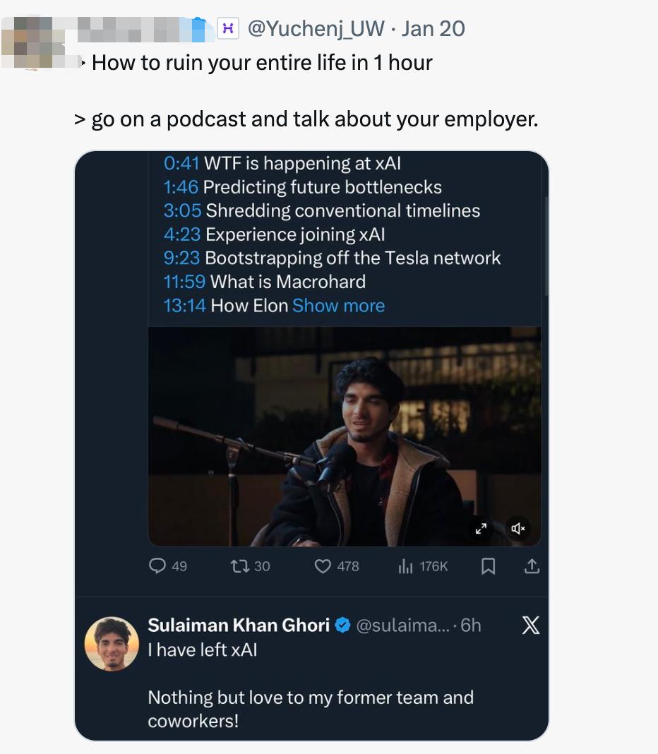 Sulaiman 自 2019 年起持续创业。在德国上大学一个月后退学,为了实现童年创办航天公司的梦想,在自家后院亲手制造过一台液体燃料火箭发动机。创业失败后,他进入 xAI。对于他的经历,有网友表示,“这位兄弟跑去上播客,没拿到明确授权,就顺手把一堆内部敏感信息抖出来,这就是纯纯的新手行为。可以说,这是职业生涯级别的大忌。任何一家严肃的公司都会立刻把你原地开除,更别说是像马斯克这样的人。”
