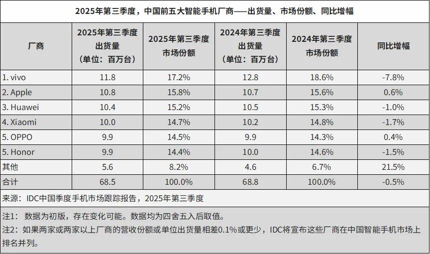 荣耀的销售曲线的确如荣耀管理层预期般有所抬升。IDC 数据显示,2025 年第三季度,荣耀终于重回中国智能手机市场前五,市占率达到 14.4%,与 OPPO 并列第五(OPPO 当季市占率为 14.5%)。