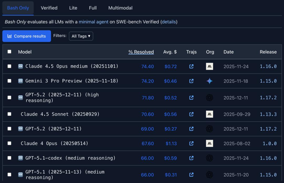 在标准的Bash Only环境中,Claude 4.5 Opus的解决率已达74.4%,而每道题目的成本仅为0.72美元。