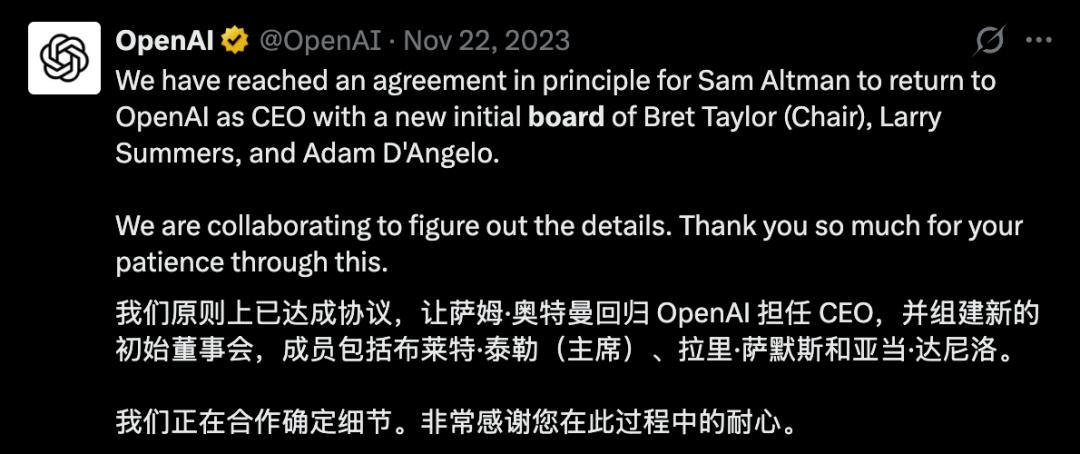 当天,OpenAI便宣布了奥特曼的回归以及新组建的董事会名单。