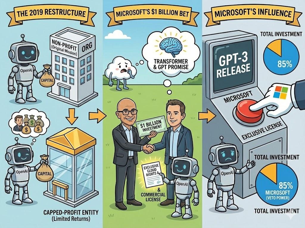 事情的转机来自第二年,OpenAI做出了一项重大决策,将公司结构进行重组,保留原先的非营利组织,但在其下方设立一个新的利润上限实体。