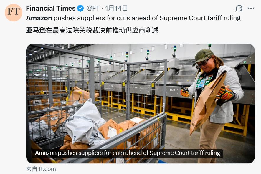 在美国最高法院对关税的裁决悬而未决的背景下,亚马逊已抢先对供应商采取举措,时机把控与力度拿捏,都释放出强烈信号: