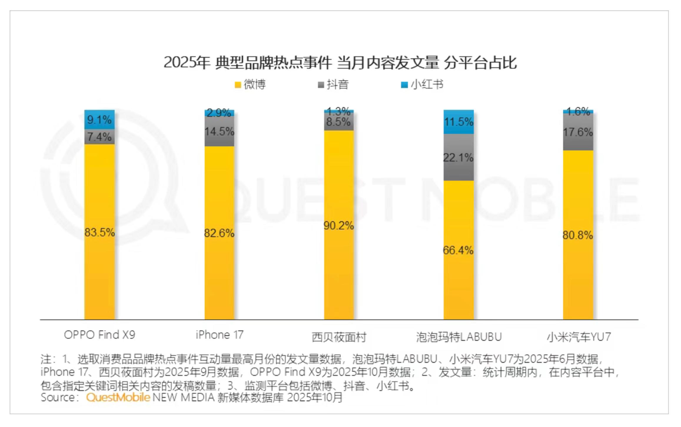 无论是OPPO、iPhone、小米汽车的新品发布,还是西贝、泡泡玛特的破圈讨论,这些2025年最具代表性的品牌大事件,其当月内容声量在微博上的占比都高度集中,且普遍超过80%。