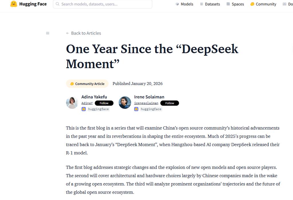1月20日,全球最大的AI开源社区Hugging Face发布深度文章——《“DeepSeek时刻”一周年》,详述了中国AI力量在过去一年如何重塑全球开源生态。