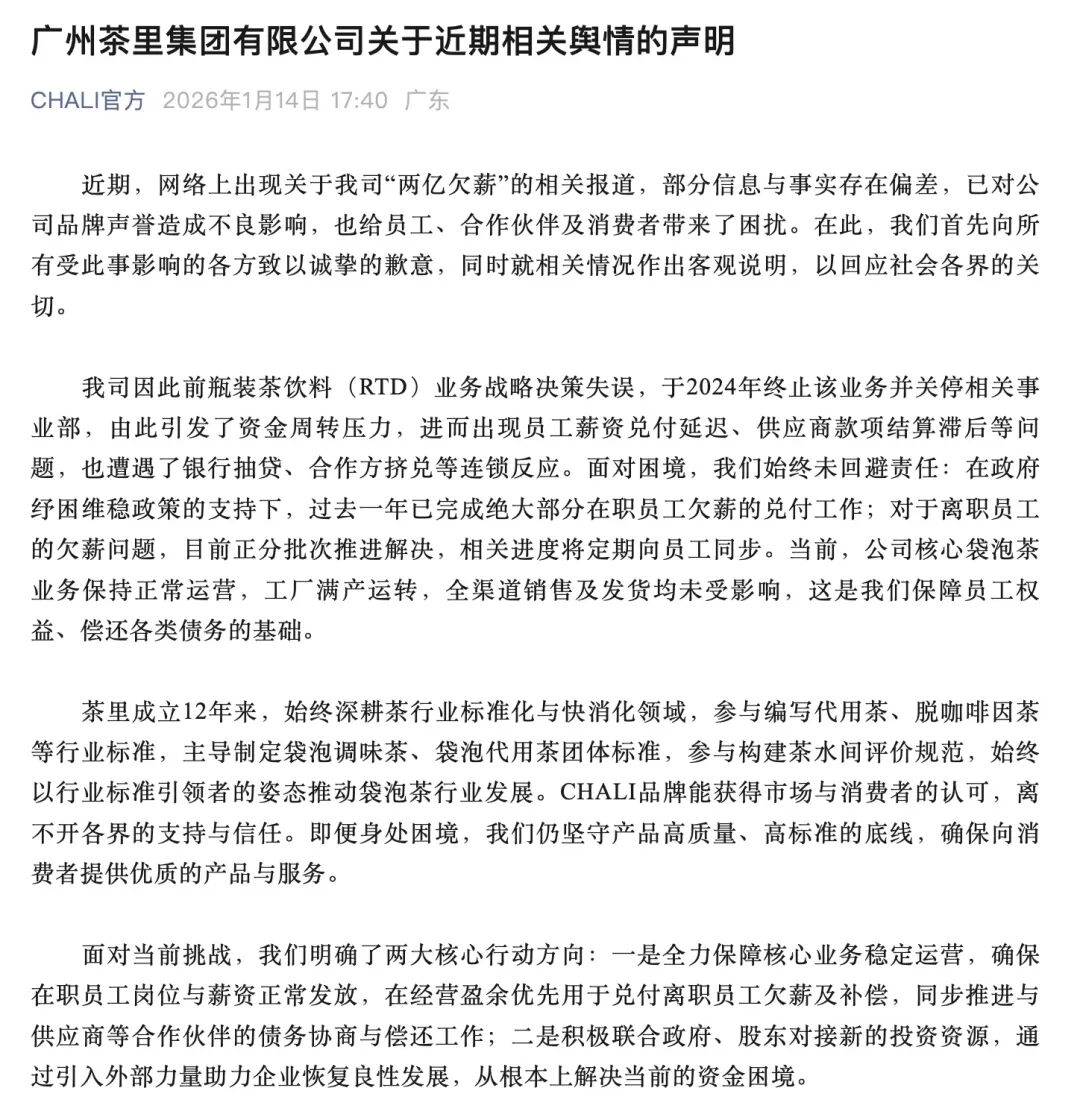 1月14日,茶里集团在《广州茶里集团有限公司关于近期相关舆情的声明》(下称“《声明》”)中称,在纾困政策支持下,过去一年已完成绝大部分在职员工欠薪的兑付工作;对于离职员工的欠薪问题,目前正分批次推进解决。