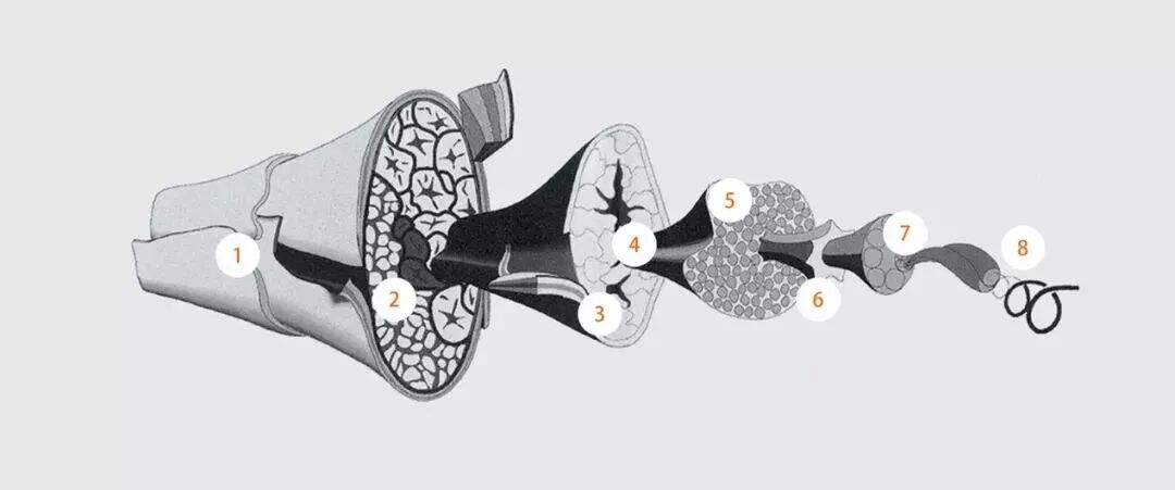 其中,皮质细胞内的长纤被叫作巨原纤,它们由一束束被基质包裹、更细的微原纤组成。基质含有高硫蛋白,可以吸收高达自身重量35%的水分而不会让人感到潮湿,帮助去除汗渍和吸收异味。
