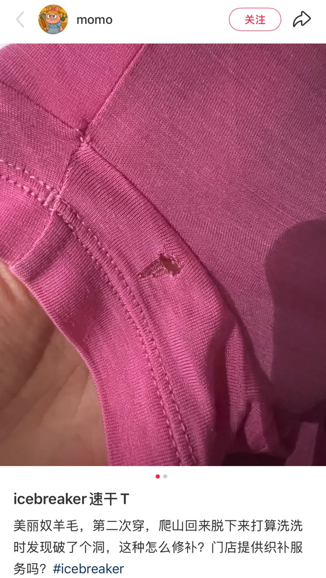丹尼徐在icebreaker门店工作时期,也遇见过消费者反馈袜子易破的问题,自己则仅在高强度徒步时,经历过一次短袖破洞。