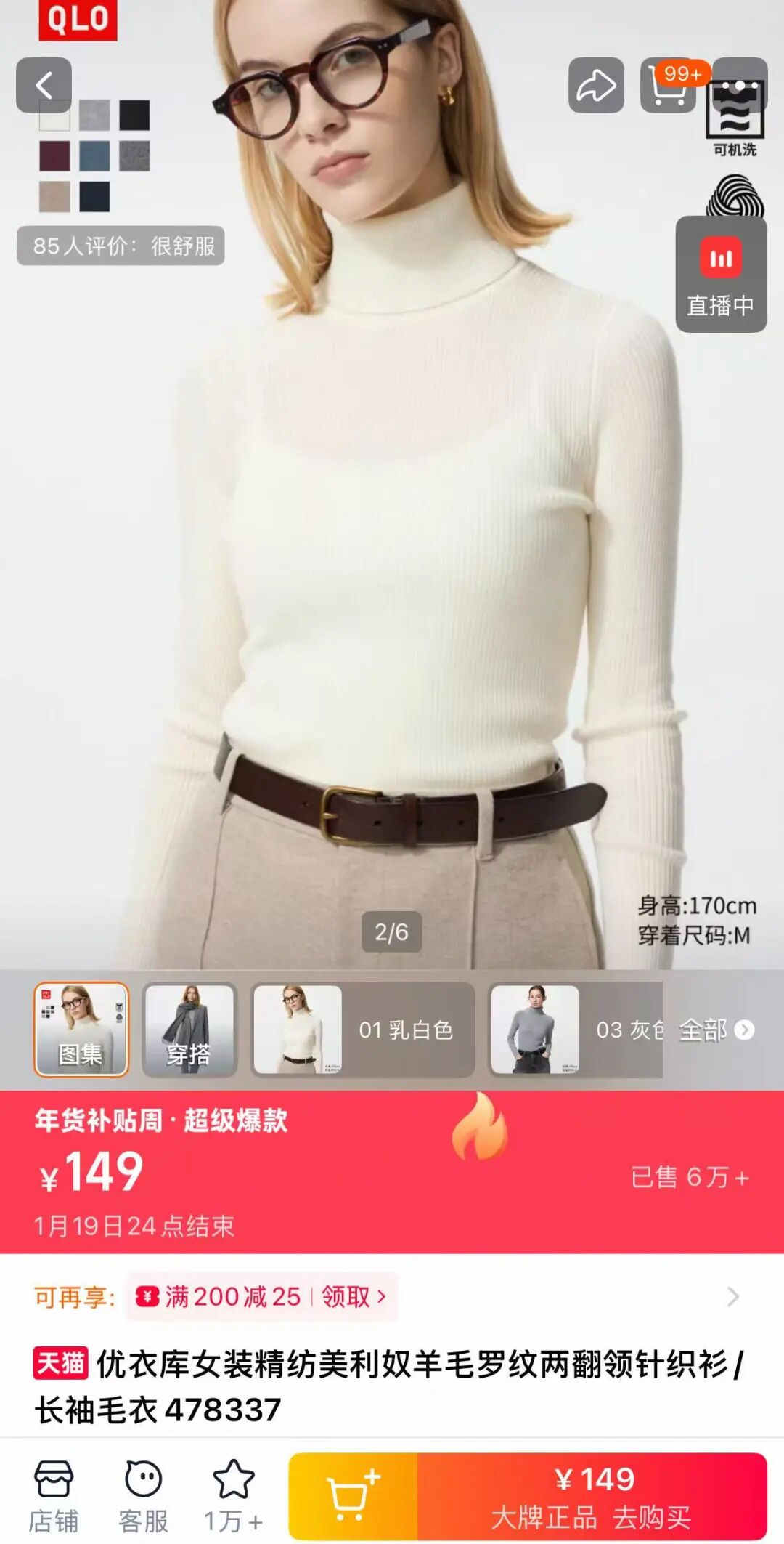 同样地,优衣库用“100%绵羊毛”为卖点的长袖毛衣,也以149元的价格斩获6万+销量。