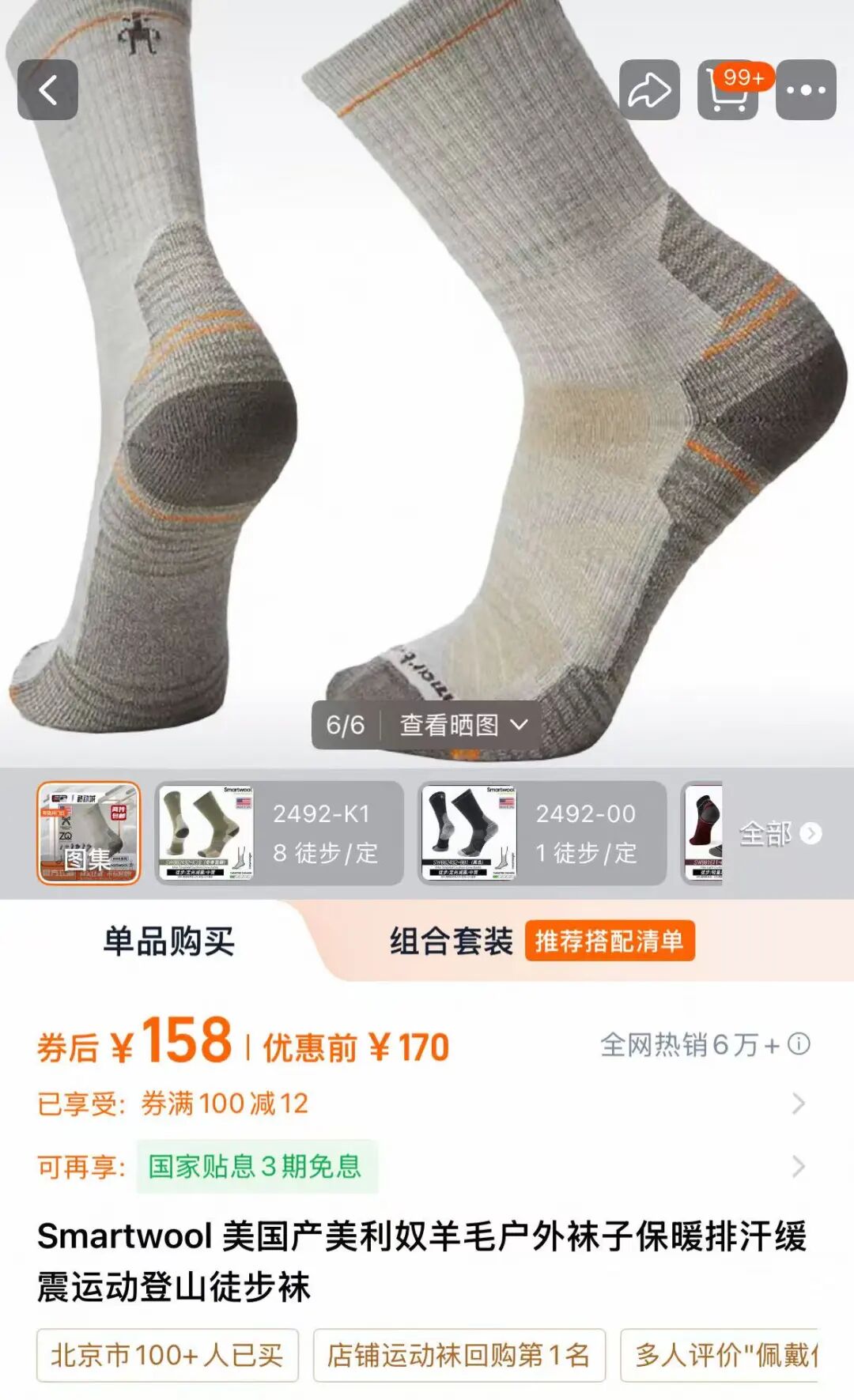 同样诞生于20世纪90年代的美国户外品牌Smartwool,凭借专业羊毛袜子圈了不少粉。其一双售价158元的美利诺羊毛袜全网成交突破6万单。