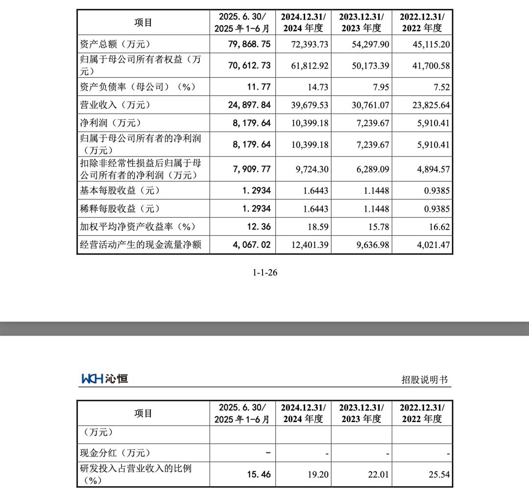 报告期内,沁恒微的营业收入分别约2.38亿、3.08亿、3.97亿、2.49亿元;净利润分别约5910.41万、7239.67万、1.04亿、8179.64万元;扣非归母净利润分别约4894.57万、6289.09万、9724.30万、7909.77万元。