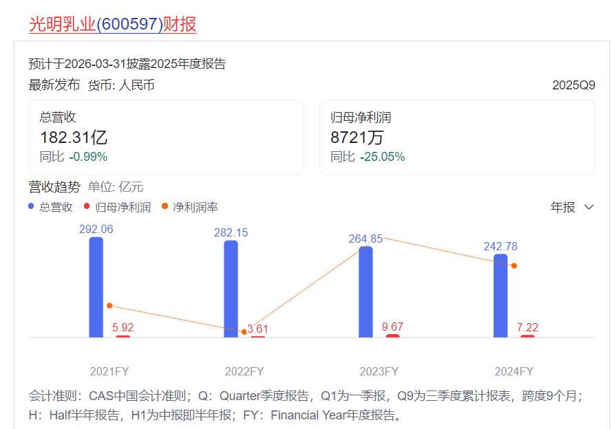 光明乳业此时“接盘”,其自身处境亦不乐观。公司营收已连续三年下滑,从2022年的292.06亿元降至2024年的242.78亿元。2025年前三季度,归母净利润同比下滑25%,第三季度甚至出现单季亏损。其早年布局的海外资产新莱特乳业,近年来持续亏损,已成为业绩拖累。