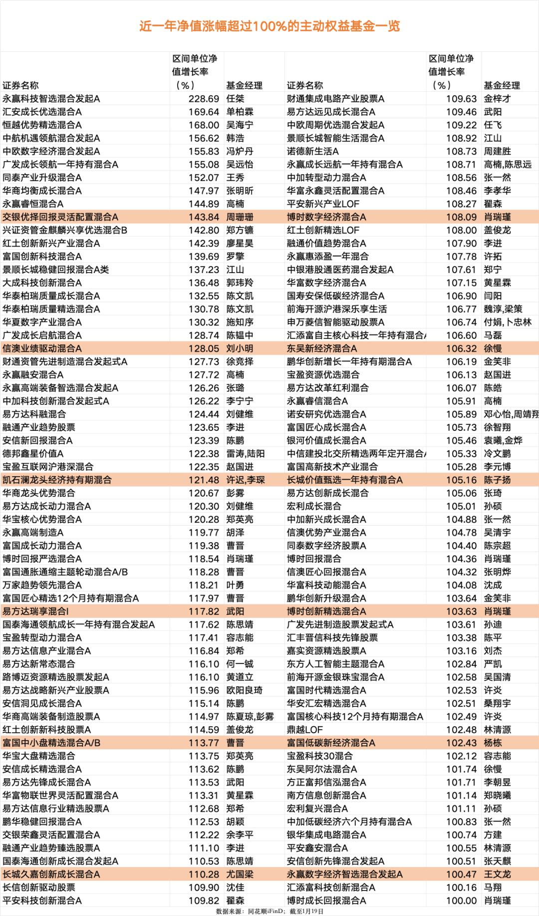 根据iFinD同花顺数据统计,截至1月19日,过去一年复权单位净值增长率超过100%的公募基金数量达到176只,其中主动权益基金达到124只。