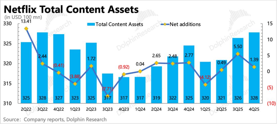 不过相比前三季度,四季度收入会受益更多的涨价效应。年末总订阅数突破3.25亿,同比增长约8%,相比去年15%左右的增速区间有明显放缓。用户增长问题应该是Netflix不惜代价要拿下WBD的核心原因,这也让市场对Netflix长期内生增长动能的担忧有所提高。
