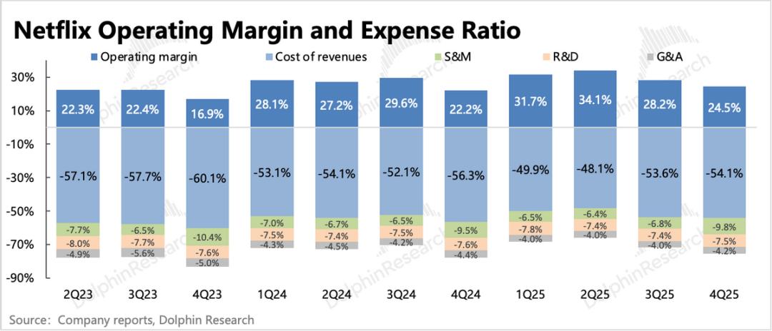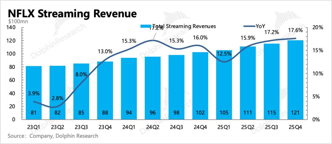 Netflix四季度实现经营利润近30亿,超出预期。一方面有收入超预期的拉动,另一方面,剩余不到2亿的巴西税费延至26年补缴,因此使得当期利润超预期、26年利润低于预期,不过影响幅度都不是很大。利润的增长最终还是主要靠收入增长激发,因此长期成长的问题更值得关注。